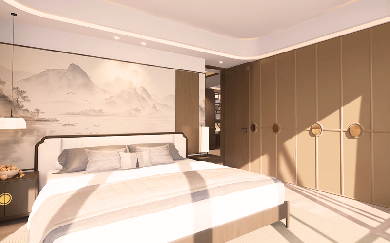 主材选用宋式标志性的白蜡木、亚麻、哑光石材,奠定素净基调;局部用复古胡桃木边柜、藤编屏风做点缀,两种木质的纹理碰撞出层次。色彩上以宋式月白、米灰为主,仅在抱枕、地毯处点缀复古焦糖棕,冷暖平衡,与窗外滇池的湖光山色遥相呼应